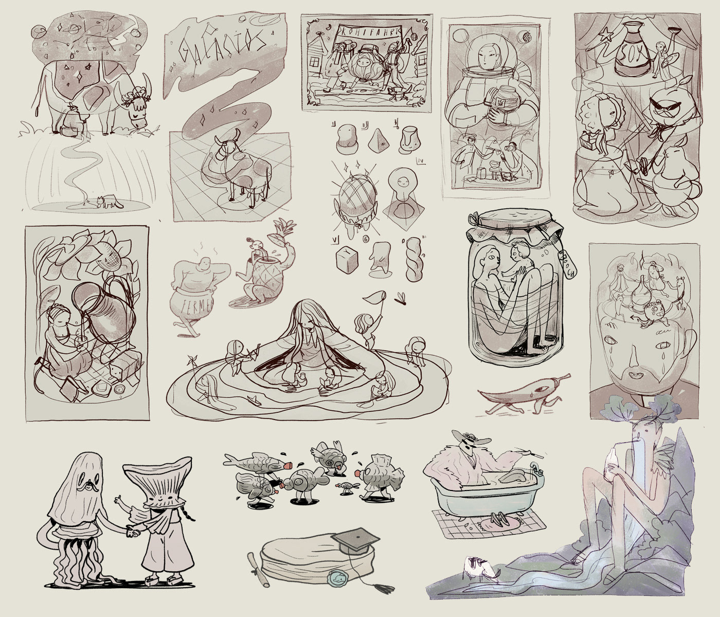 There are 7 single page and 3 double page illustrations and around 60 little spot fillers + the cover of course, and the publisher described my style as 'gastro-surrealism' and I thought it was perfect - a category I didn't know existed that I was a sole contributor to.