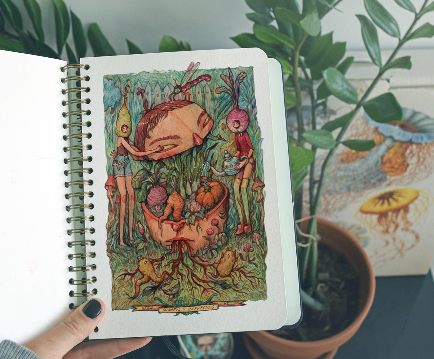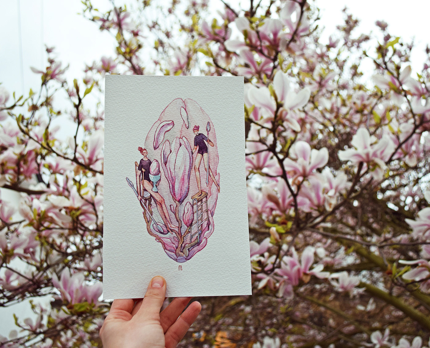 We often design little comfort spots that let a part of our mind sit there while things get tough. This watercolor work was the last I did this summer, and it has a lot of things cosy and peaceful: fireplaces, trees, cats, sunsets and tree houses 🌱A little safe spot to rest one's mind and soul, even if it's just for a bit.